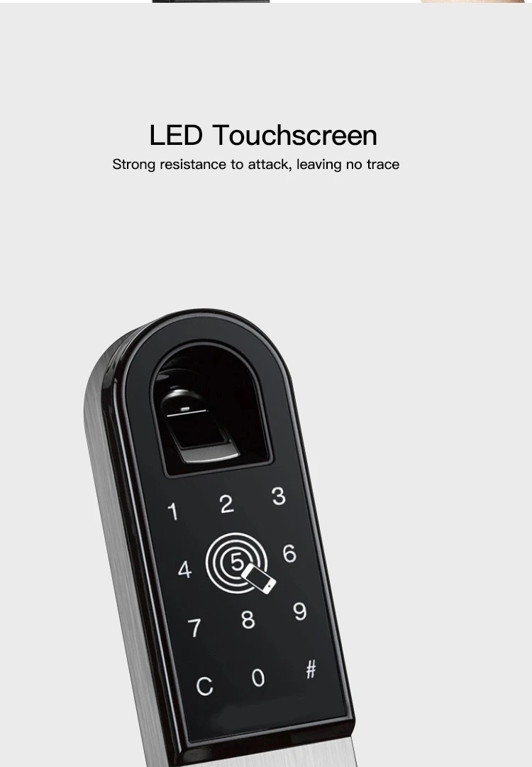 * Unlock mode: Fingerprint +Password+ Card + Key * English voice operation system: Yes * Card User: 100 * Fingerprint User: 100 * Password User: 100 * Fingerprint read: Biometrics sensor * Color: silver/black/red bronze * Chip Type: Mifare 1k 13.56mhz * Lock Cylinder: Class C * Read time: less than 1 seconds * Type keypad: Touch screen keypad * Working power: 4 pcs AA batterie ( no include) * Password function: support virtual password * Suit for the door thickness about 40-110mm * Keep-open settings:3 +7+press unlock key,the door is in stay-open status Detailed Images ![]() |